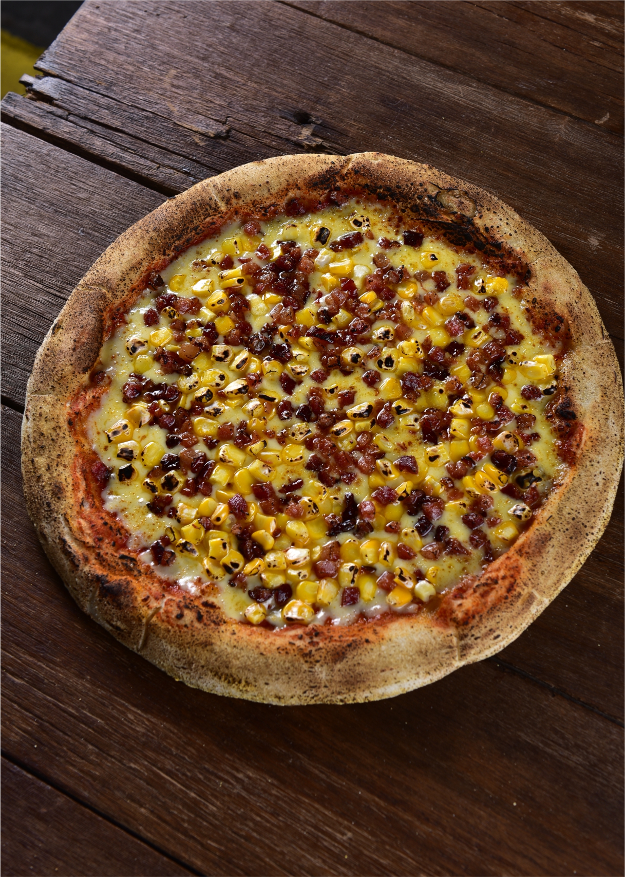 • Molho de tomate caseiro, queijo mussarela, milho e bacon.
